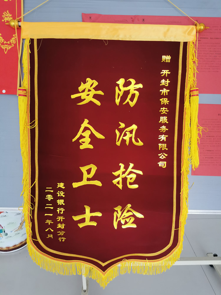 8月24日,中國(guó)建設(shè)銀行開封分行李行長(zhǎng)等一行4人,向公司贈(zèng)送寫有“防汛搶險(xiǎn)安全衛(wèi)士”的錦旗,以感謝公司派駐該銀行的保安隊(duì)員在近期重大汛情考驗(yàn)中防汛搶險(xiǎn)的突出表現(xiàn)。