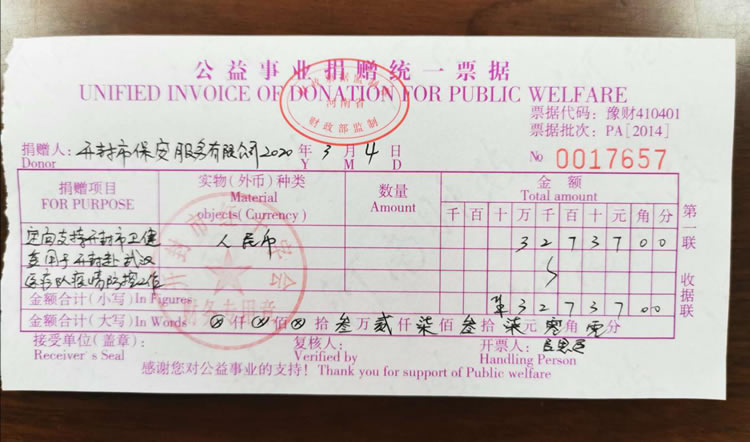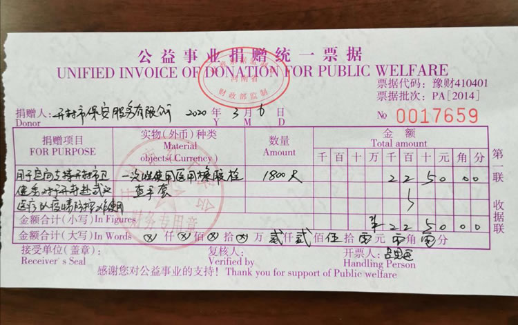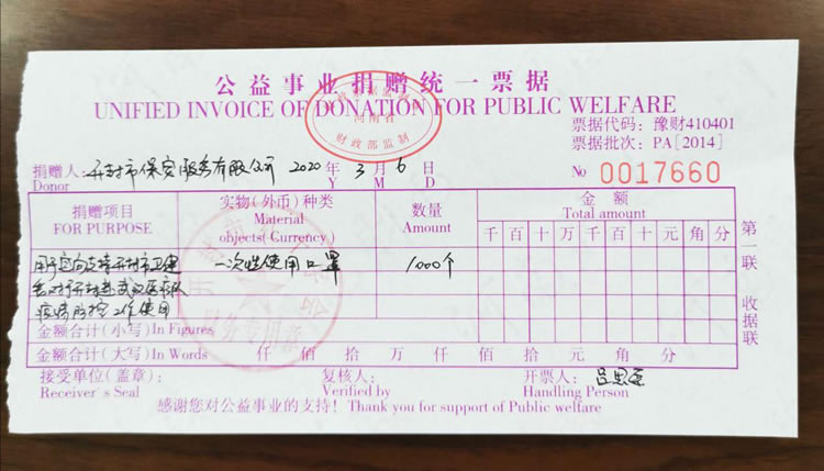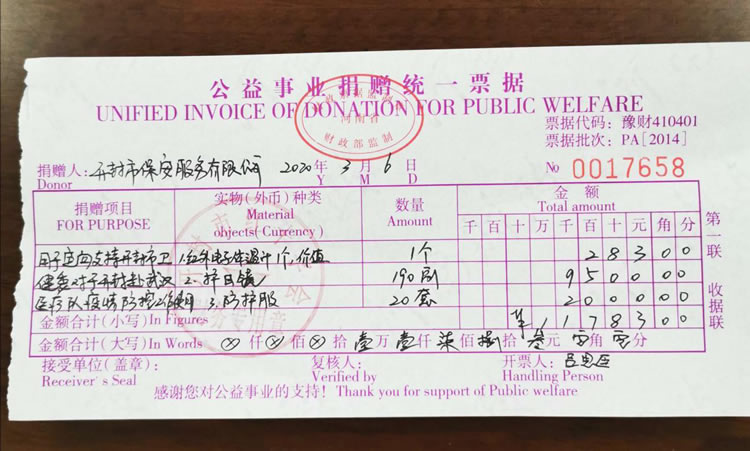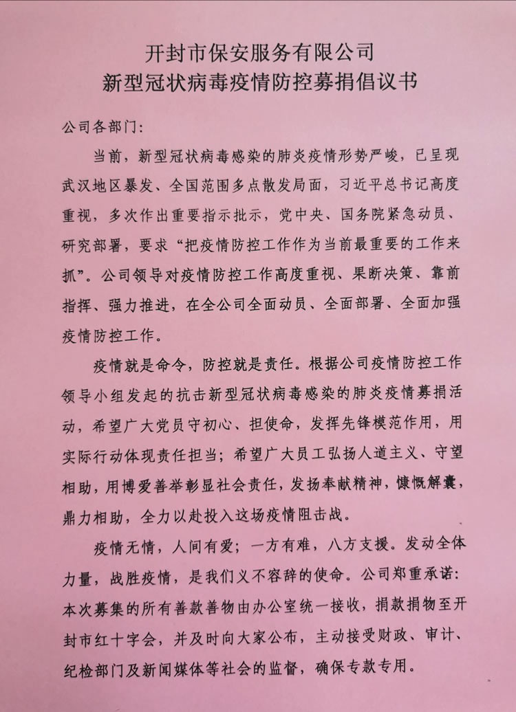 2020年3月2日,公司發(fā)起了新型冠狀病毒疫情防控募捐倡議書,倡議全體人員捐款、捐物支援疫情嚴重地區(qū),助力武漢抗擊疫情。全體員工積極響應,紛紛捐款,僅一天時間就籌集善款32737元。公司孫國杰總經(jīng)理在抗疫物資緊缺的情況下,多方聯(lián)系外地的廠家,購買防疫物資,此次公司向開封市紅十字會捐贈抗疫物品一批,價值18033元:醫(yī)用一次性口罩1000個、護目鏡190個、防護服20套、醫(yī)用一次性手套1800只、電子體溫計1個。并及時通過河南省保安協(xié)會聯(lián)系疫情嚴重地區(qū)(湖北省保安協(xié)會),向災區(qū)保安員表示慰問。
