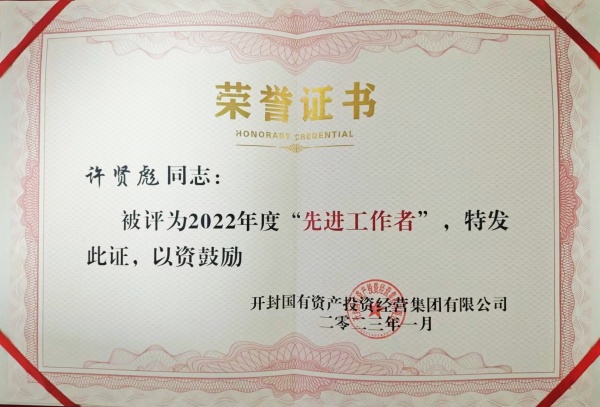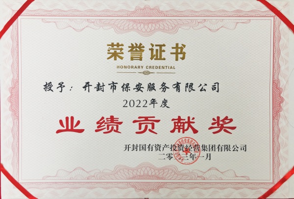 2023年1月16日,在開封國投集團(tuán)召開的2022年度年終總結(jié)暨表彰大會中,開封市保安服務(wù)有限公司榮獲“2022年度業(yè)績貢獻(xiàn)獎(jiǎng)”,公司員工許賢彪同志榮獲“2022年度**工作者”稱號。